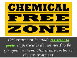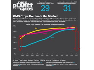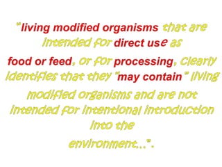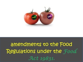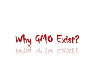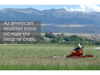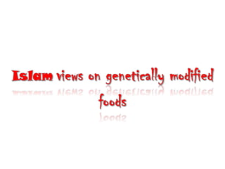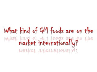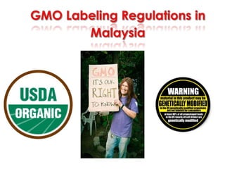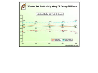 This document discusses genetically modified foods (GMOs) and public attitudes towards them. It provides statistics showing the global production of major GMO crops and countries growing them. It also summarizes various studies that have found health issues with GMOs, such as fertility problems in mice fed GM corn and high mortality in hamsters fed GM soy. The document discusses concerns from Islamic scholars about GMOs containing genes from pigs. It notes that surveys found women to be more cautious about GMOs than men. The document outlines Malaysia's regulations on GMO labeling and concludes that increasing consumer knowledge about GMO benefits could help lower risk perceptions.