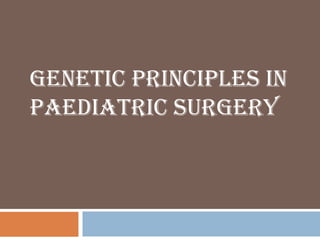 This document discusses genetic principles in paediatric surgery. It defines genetic disorders, congenital anomalies, and birth defects. It then classifies genetic disorders and describes different types of congenital malformations such as deformation, disruption, dysplasia, and more. The document also discusses specific genetic conditions commonly encountered in paediatric surgical wards and their associated genetic syndromes. It emphasizes the importance of a collaborative assessment and available diagnostic tools for evaluating children with birth defects. Prevention and treatment options are also outlined.
