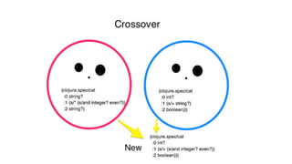 This document discusses using genetic programming and Clojure.spec to evolve program specifications that can describe sample data. It begins with an overview of genetic programming and the four tribes of programmers. It then explains how Clojure.spec allows defining specs, validating data against specs, and generating data from specs. The document demonstrates evolving a population of spec programs to find one that perfectly describes some sample data, and discusses how the evolved spec can now generate new data. It concludes by discussing possibilities for using Clojure.spec to enable self-healing code through horizontal code transfer between donor functions.