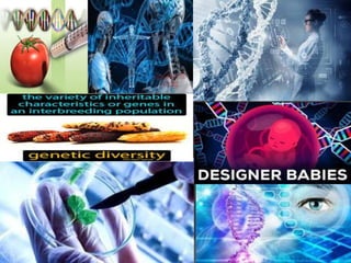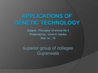 This document provides an overview of genetic technology techniques including selective breeding, hybridization, DNA extraction, restriction enzymes, gel electrophoresis, polymerase chain reaction, genetic engineering, and transformation. It discusses applications like genetically modified animals and plants. Transgenic organisms created through recombinant DNA techniques are described. The document also touches on genome sequencing, biotechnology, cloning, and some products enabled by genetic technology.