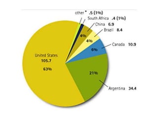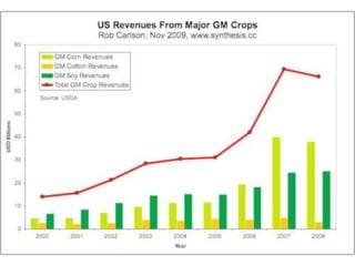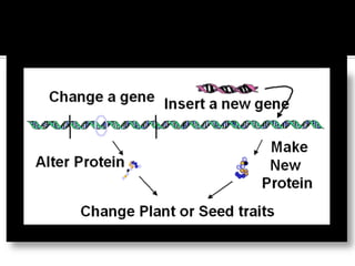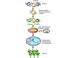 The document discusses genetically modified foods (GMOs). It defines GMOs as foods that have been genetically enhanced through molecular biology techniques such as transferring genes from donor organisms. The document outlines the process of genetic engineering and provides examples of commonly genetically modified crops like corn, soybeans and cotton. It notes both potential advantages of GMOs, like pest resistance and higher yields, and disadvantages such as possible human health and environmental risks.