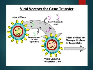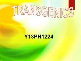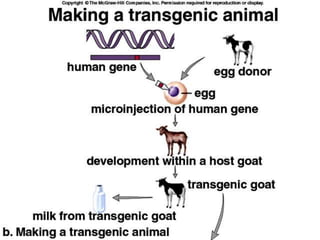 This document discusses genetically modified organisms (GMOs) and transgenic animals. It begins by defining a GMO as an organism whose genetic material has been altered by inserting DNA from another organism. Currently, most GM crops contain bacterial genes for pest or herbicide resistance. The document then discusses three main methods for producing transgenic animals: DNA microinjection, retrovirus-mediated gene transfer, and embryonic stem cell-mediated gene transfer. Transgenic animals have applications in agriculture, medicine, and industry by improving crop yields, providing organs for transplantation, and producing useful proteins.
