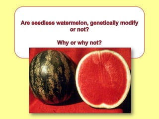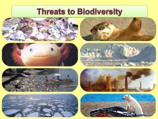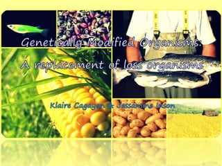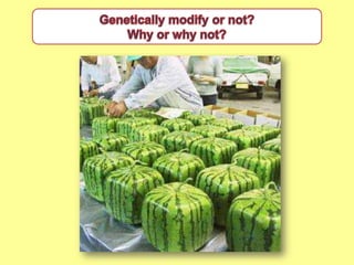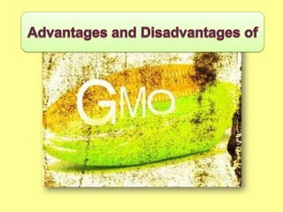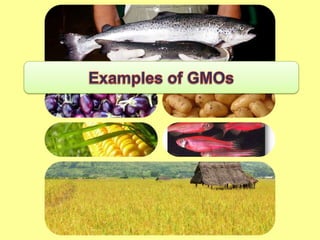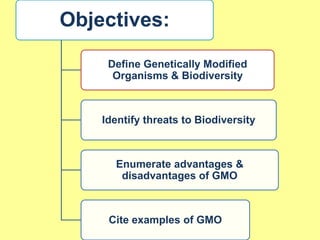 This document defines genetically modified organisms and biodiversity. It identifies threats to biodiversity such as habitat loss, invasive species, pollution and climate change. The document then enumerates advantages of GMOs such as increased agriculture, carbon storage, reduced pesticide use and edible vaccines. Potential disadvantages include genetic contamination, competition with natural species, increased selection pressure and the impossibility of follow up. Examples of GM crops including Bt corn, Bt eggplant, Bt potato and biofortified crops are provided.
