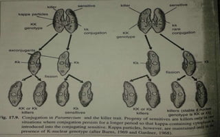 Certain intracellular parasites like bacteria and viruses can maintain symbiotic relationships with host cells and exhibit heritable transmission of their own. Examples include sigma particles, an infectious DNA virus, that causes CO2 sensitivity in certain Drosophila strains and is transmitted maternally. Kappa particles, which are symbiotic bacteria, produce a toxic substance in some Paramecium strains called "killers" that is lethal to other strains called "sensitives". The presence of kappa particles depends on a dominant nuclear gene. A similar "milk factor" transmitted in mouse milk can induce mammary cancer and is also transmitted through saliva and semen, depending on nuclear genes.
