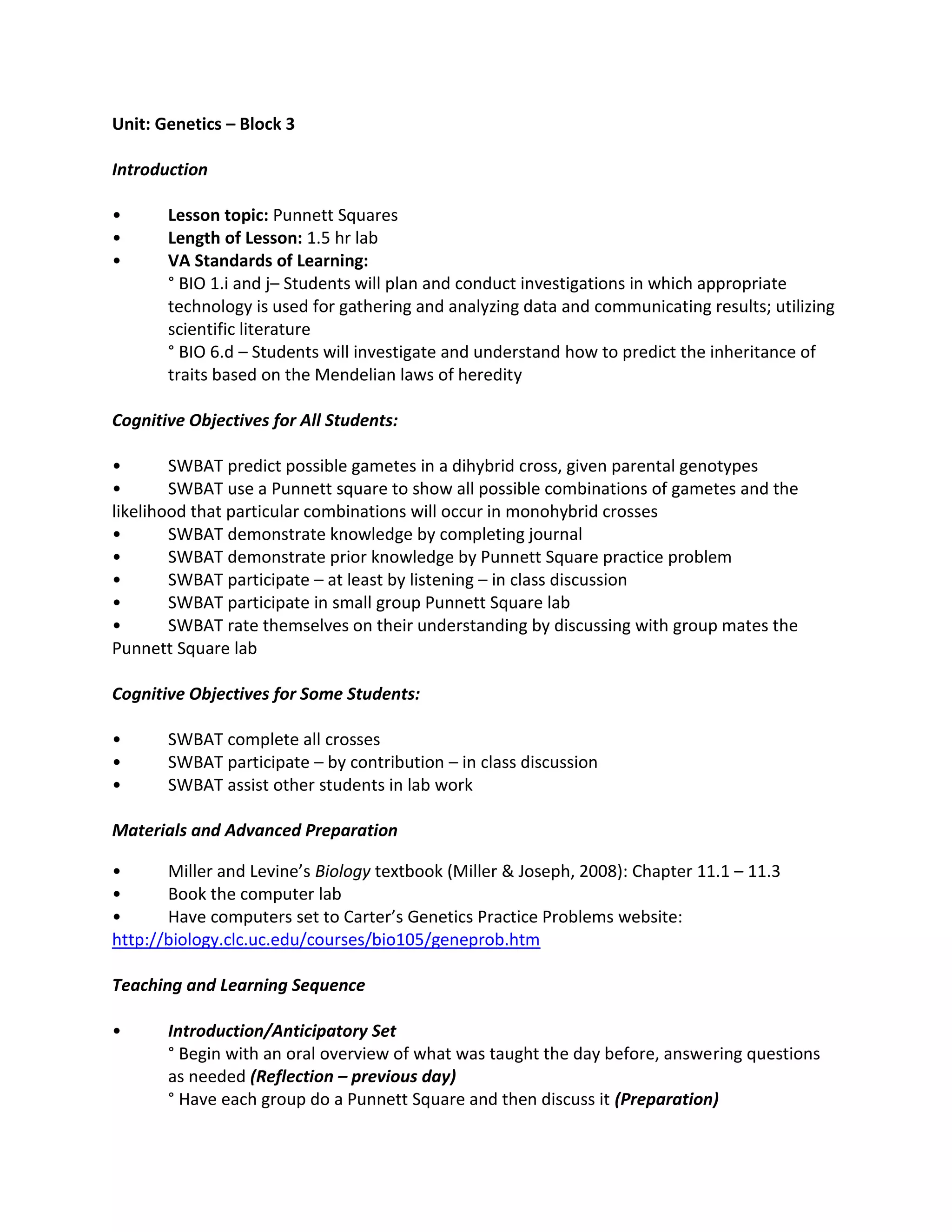 This lesson plan is for a 1.5 hour genetics lab on Punnett squares. Students will work in groups to complete 12 practice problems using Punnett squares to predict possible offspring genotypes. The lesson will begin with a review from the previous day and an example problem. Students will then work through the problems in their lab journals with assistance from their group mates. To check understanding, the teacher will review the students' journal answers before moving on to the next topic. For homework, students will read the next chapter in preparation for the following day's lab on mutations.