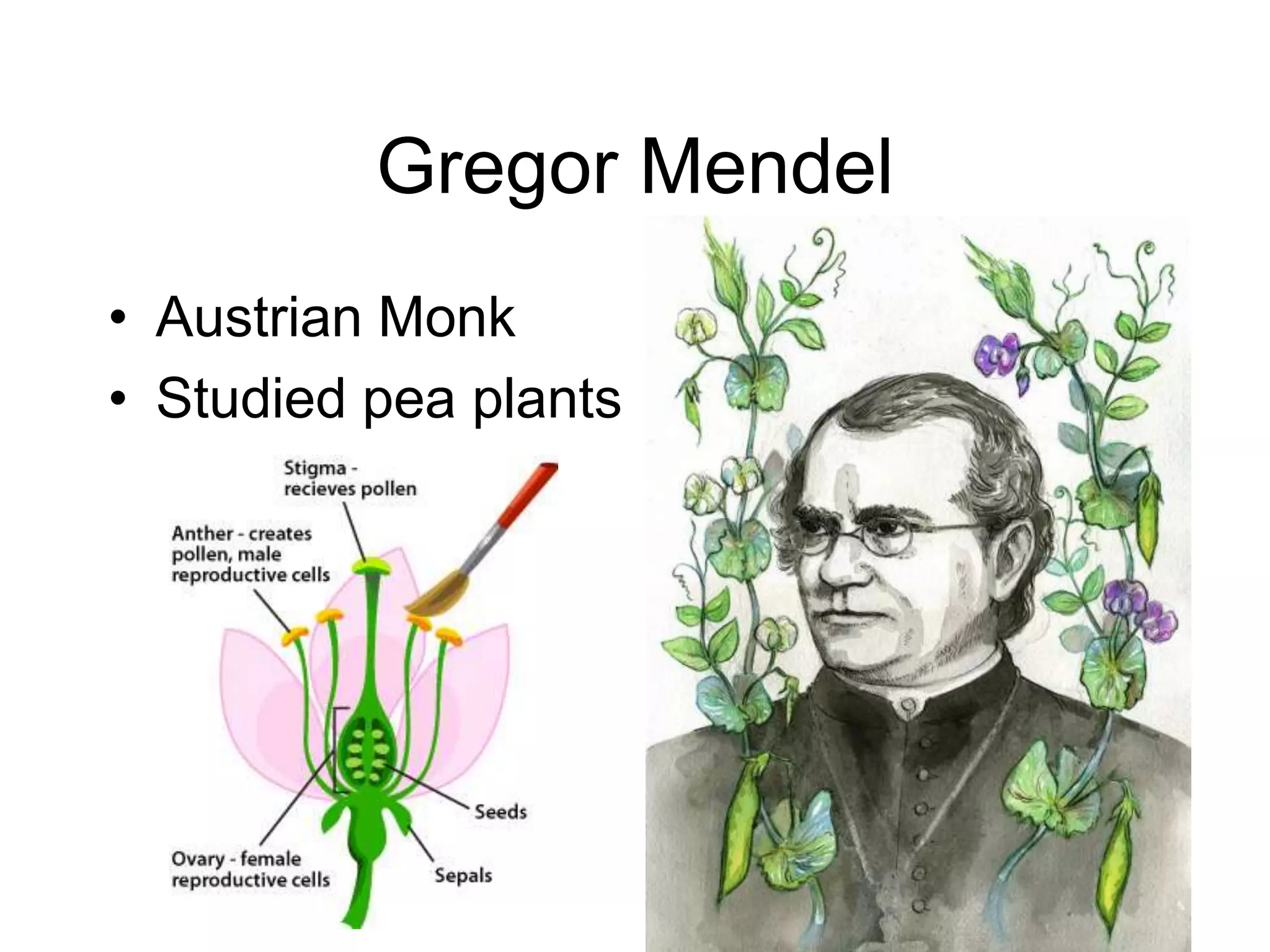 Gregor Mendel studied inheritance through pea plant experiments in the mid-1800s. He found that alleles (versions of genes) show up in predictable patterns, with some alleles being dominant over others. Mendel also discovered that alleles segregate and assort independently during reproduction, laying the foundations for modern genetics.