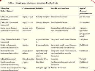 The document discusses several single-gene disorders that can cause ischemic stroke, including: