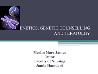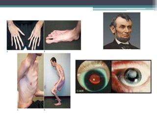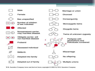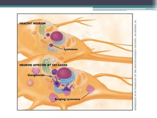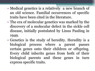 This document provides information on various genetics concepts including genes, chromosomes, inheritance patterns, and examples of genetic disorders. It discusses the basics of genetics including definitions of key terms like gene, chromosome, karyotype, genotype, phenotype, alleles, mutation, and inheritance patterns such as autosomal recessive, autosomal dominant, X-linked recessive, and examples for each. Specific genetic disorders discussed include cystic fibrosis, mucopolysaccharidoses, phenylketonuria, sickle cell disease, Tay-Sachs disease, and Duchenne muscular dystrophy.