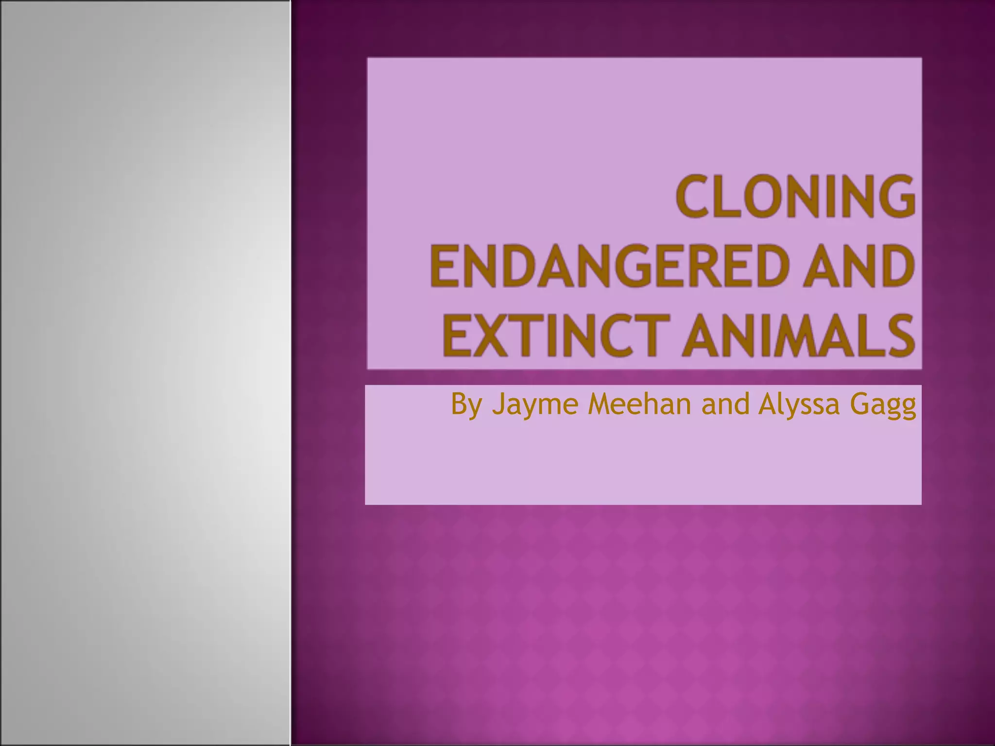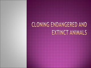 1) Cloning endangered animals is controversial as it may disrupt natural habitats and populations. Critics argue that cloning focuses on technology rather than addressing the root causes of extinction like habitat loss.