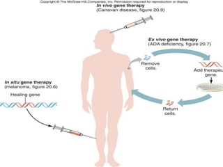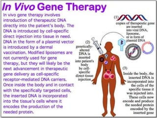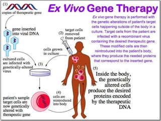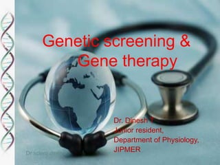 This document discusses the history and current state of genetic screening, genetic counseling, and gene therapy. It provides a timeline of major developments in these fields from 1961 to 2008. Key points include the first approved gene therapy case in 1990, the first gene therapy treatment for ADA deficiency in 2002, and over 1,200 genetic tests being available by 2008. The document also describes various genetic screening tests, the role of genetic counseling, methods of genetic screening and gene therapy delivery, as well as challenges and applications of these emerging fields.