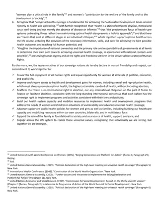 3. The document commits to ensuring access to health services for women, supporting families, and engaging internationally to realize universal human rights and health for all.