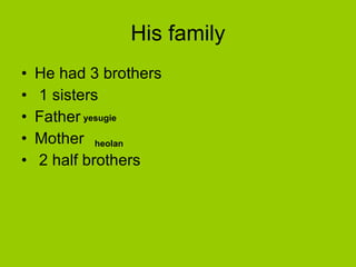 Genghis Khan was born around 1162 and died around 1227. He had 3 brothers, 1 sister, and 2 half brothers. His religion was Shamanism or Tengriism, though he was interested in learning about other religions like Christianity and Islam. He had 6 wives and received sex education at age 9. While he conquered much of Mongolia, Genghis Khan did not conquer every area.