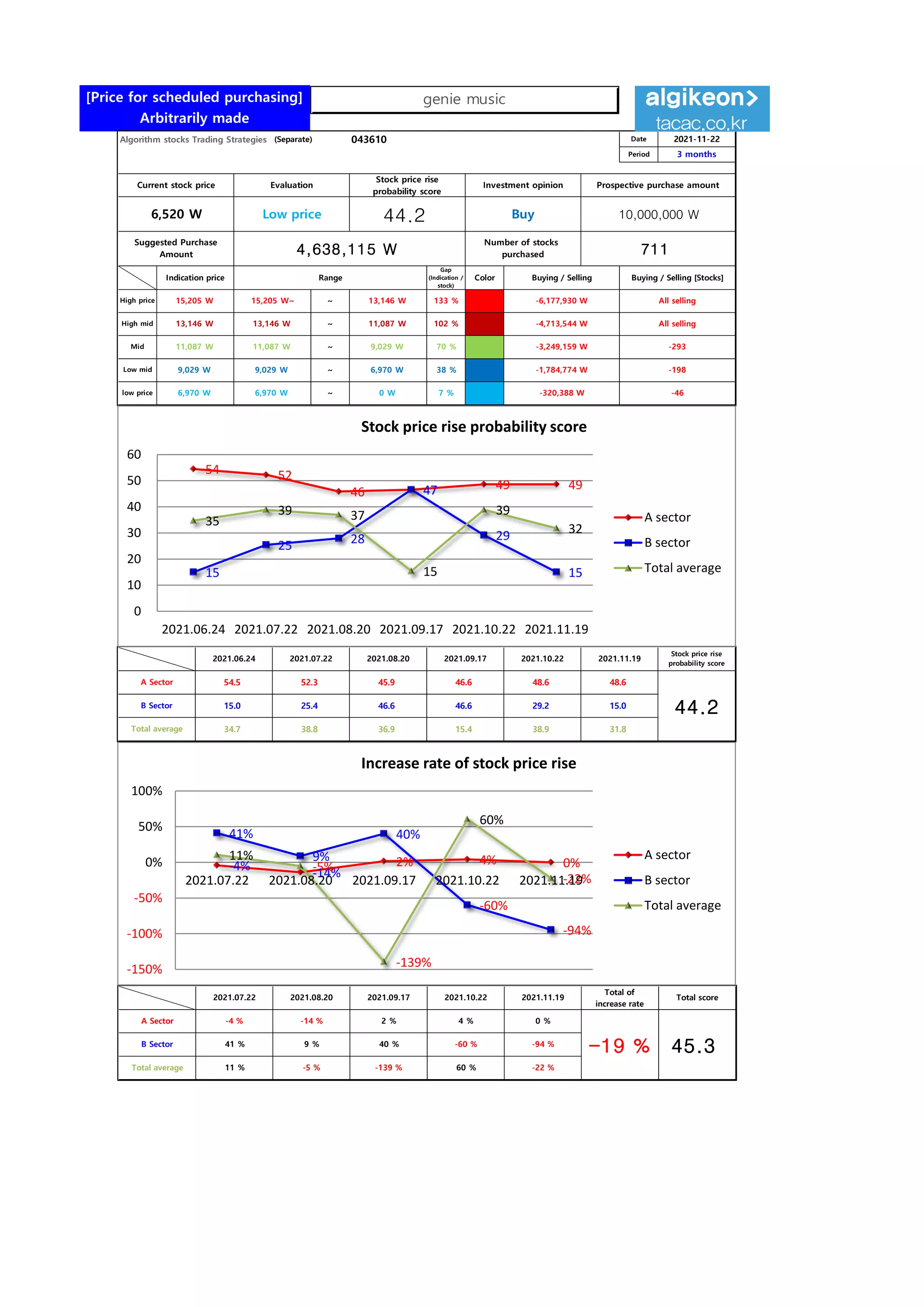 This document provides a performance analysis of an algorithm (separate) from December 2018 to November 2021. It includes quarterly and annual sales, operating profit, net income, profit margins, debt ratios, and other financial metrics. It also analyzes the company's stock price probability, trading strategies, and investment opinions. The analysis uses an algorithm program to evaluate the company and provide purchase recommendations.