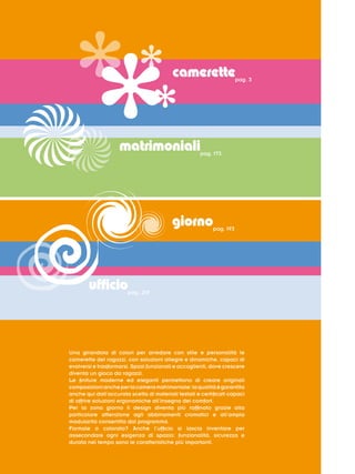 Il documento descrive una serie di soluzioni di arredamento per camerette, evidenziando design pratici e funzionali che ottimizzano lo spazio. Propone letti multifunzionali, scrivanie con organizzazione intelligente e librerie creative, perfette per soddisfare le esigenze dei bambini e adolescenti. Vengono sottolineati colori vivaci e forme morbide per creare ambienti accoglienti e dinamici.