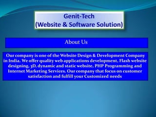Genit-Tech is an Indian company offering a variety of web services including web design, development, hosting, and digital marketing. They provide customizable service packages for static and dynamic websites with pricing based on the number of pages and features. Potential clients can view their portfolio and contact the company for more information.