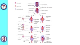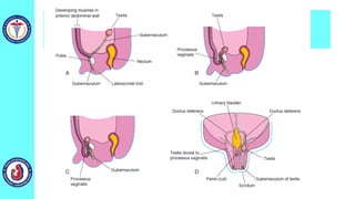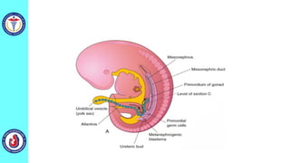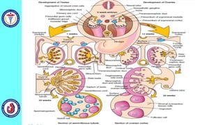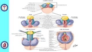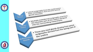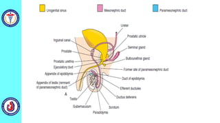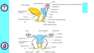 The genital system develops from three main sources: the primordial germ cells, the indifferent gonads that develop into either ovaries or testes, and the genital ducts including the Müllerian and Wolffian ducts. In males, testosterone causes the Wolffian ducts to form the epididymis, vas deferens and seminal vesicles while regressing the Müllerian ducts. In females, the lack of testosterone causes the Müllerian ducts to form the fallopian tubes, uterus and upper vagina while regressing the Wolffian ducts. The external genitalia initially develop in an indifferent state before differentiating into either male or female forms based on hormone levels.