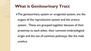 The document provides information on assessing the genitourinary tract, which includes the urinary and reproductive systems. It describes inspection, percussion, and palpation techniques for examining the kidneys, bladder, penis, testes, and female external and internal genitalia. Abnormalities that can affect the systems are also outlined, such as benign prostatic hyperplasia, urinary tract stones, endometriosis, prostate cancer, and erectile dysfunction.