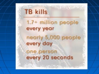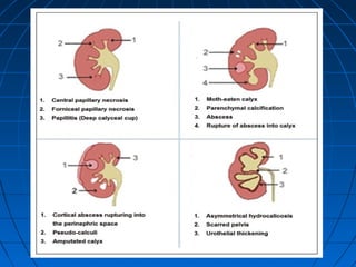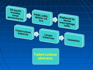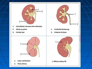 Tuberculosis can infect the genitourinary system and cause lesions in the kidneys, ureters, bladder, and genital organs. Radiographic imaging plays an important role in diagnosis and can reveal findings like renal calcifications, ureteral strictures, and bladder wall thickening indicative of genitourinary tuberculosis. The document discusses the pathology, clinical presentation, diagnostic tests including urine examination, tuberculin skin testing, and radiography that are used to identify genitourinary tuberculosis.