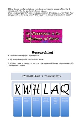 This document provides a brainstorming guide for students to use during their Genius Time period. It instructs students to list physical and mental activities they have wanted to do but never been able to. It also has them think of ways to help their community and school. Students are then asked to choose their top three ideas and write for 5 minutes each on the goals, steps to achieve them, potential help needed, and how to work on it weekly. Finally, it guides students to begin researching their chosen project by outlining the topic, goals, and necessary knowledge.