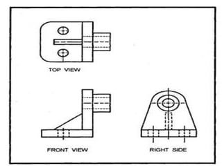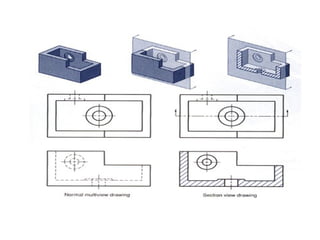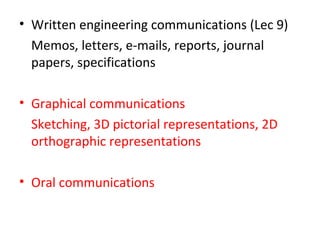 This document discusses engineering communications, including written, graphical, and oral communications. It focuses on graphical communications, describing types of graphical representations like sketching, pictorial representations, and orthographic representations. It notes that engineers must be able to create and read graphical representations to describe their work. The document also briefly discusses the importance of oral communications and how engineers must prepare and deliver presentations professionally.