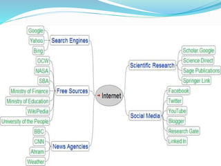 The document summarizes various free online information sources including search engines, open courseware, NASA resources, and Wikipedia. It provides details on the most popular search engines like Google, Yahoo, and Bing. It explains that open courseware shares university course materials freely online, with MIT starting the movement in 2002. NASA's website offers agency news, reports, educational resources for students and teachers. Wikipedia is an online encyclopedia that anyone can edit, though it relies on other users to correct any mistakes.