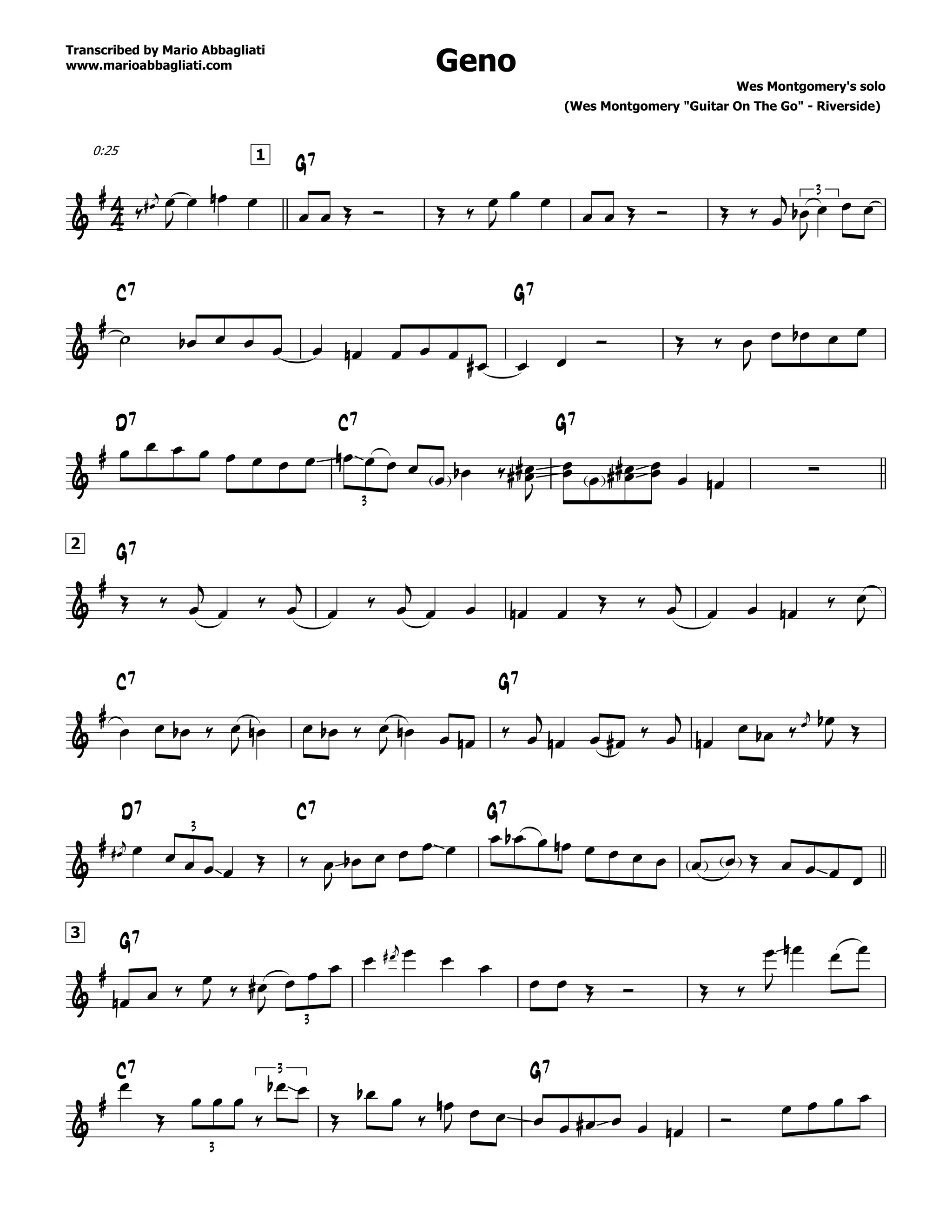 This document provides a musical transcription of Wes Montgomery's guitar solo on the song "Geno" from his album "Guitar On The Go". The solo is played over the chord progression G7, C7, D7, and lasts approximately 1 minute and 15 seconds. It features Montgomery's characteristic octave lines and intricate single-note phrasing. The solo moves fluidly between the changes and highlights Montgomery's virtuosic yet melodic soloing style.