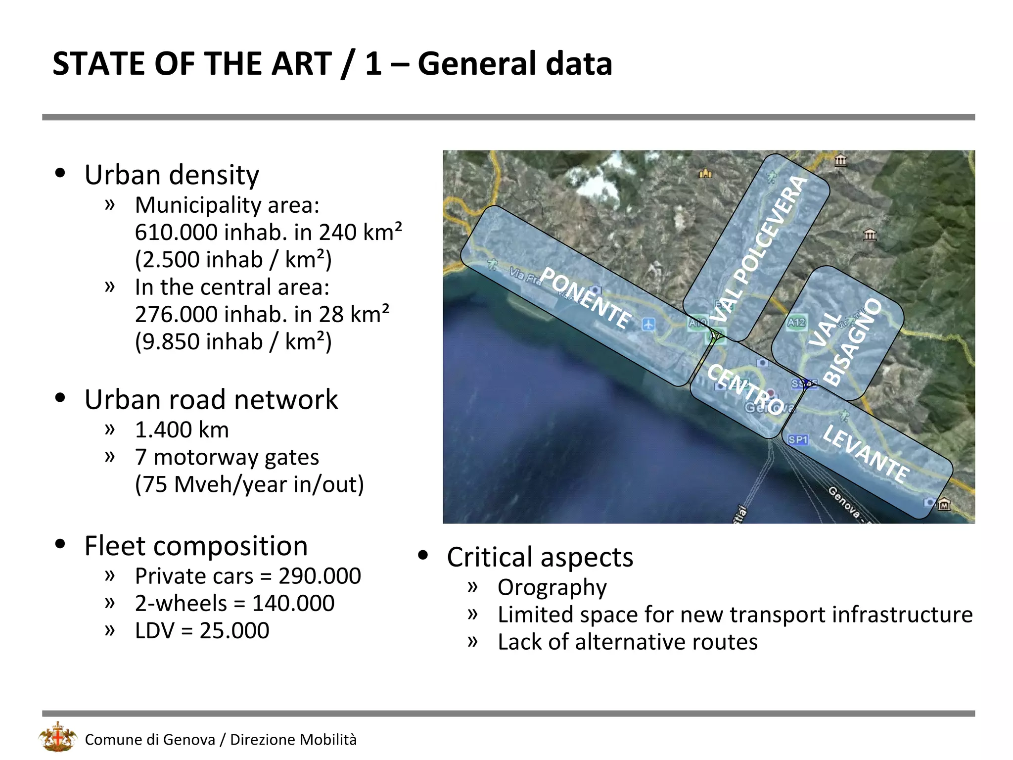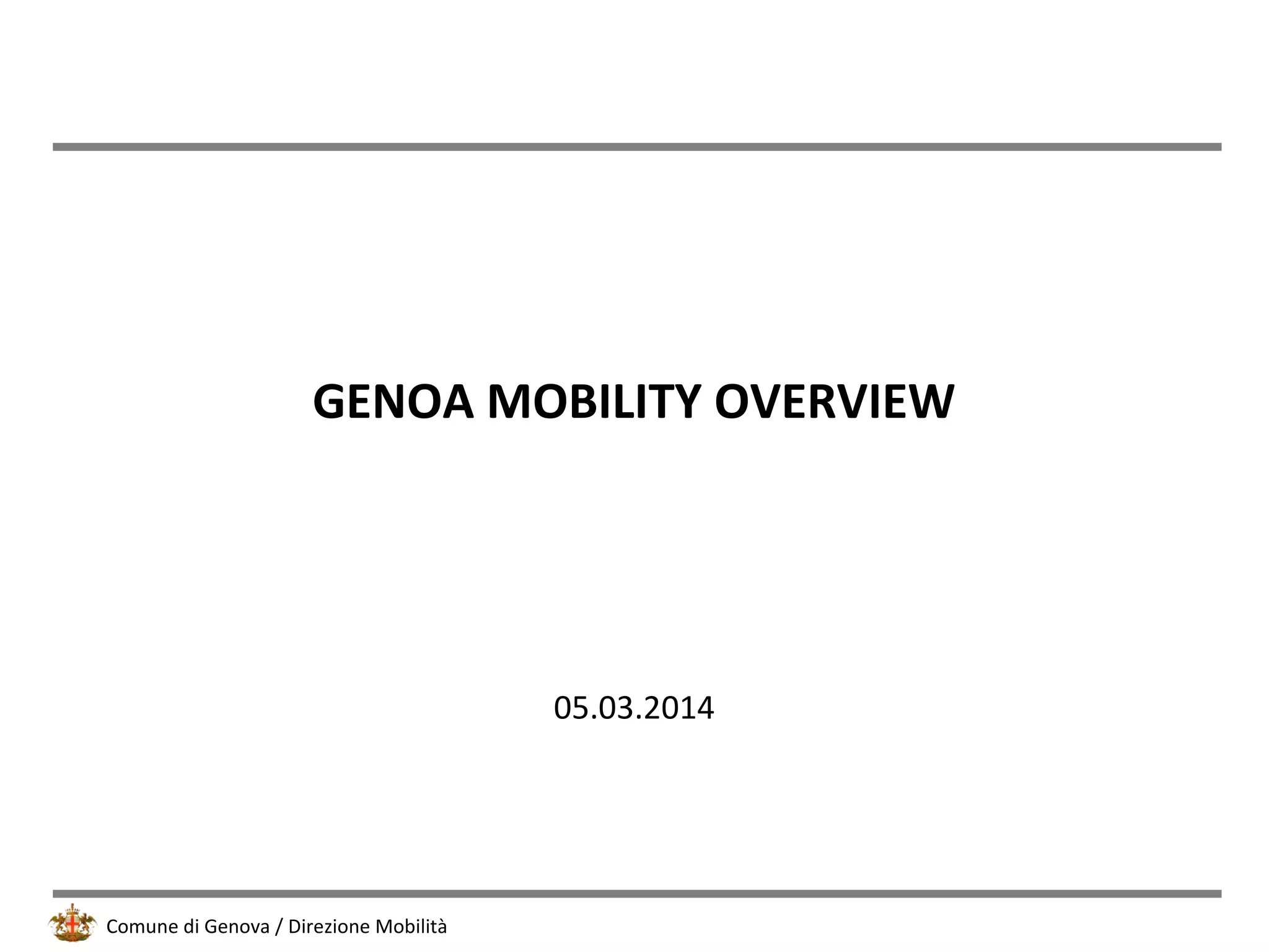 The document provides an overview of mobility in Genoa, Italy. It details the city's population density, road network, vehicle fleet, and key challenges related to its hilly terrain and limited space. Public transportation accounts for 43% of trips, consisting of buses, a metro line, ferries, and trains. The city's Sustainable Urban Mobility Plan, approved in 2010, aims to improve pollution, safety, travel times through investments in public transit, cycling infrastructure, parking policies, and restricted traffic zones through 2024. The mobility department also leads innovation projects to promote sustainable transportation.