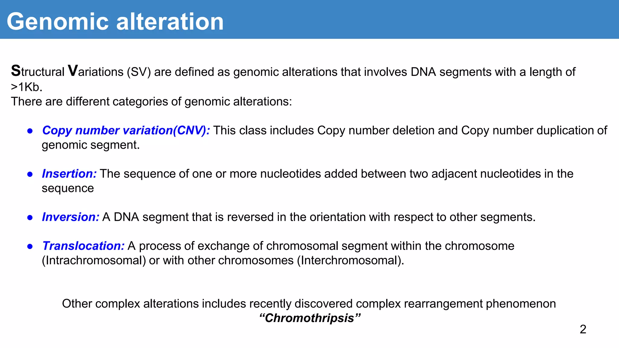 The document discusses genomic alterations identified through sequencing data, focusing on structural variations such as copy number variations (CNV), insertions, inversions, and translocations. It highlights various detection methods for these alterations, including array comparative genomic hybridization and next-generation sequencing (NGS) techniques, while emphasizing the advantages of NGS for precise characterization. The necessity for more robust algorithms is also noted, as current methods yield variable results in genomic alteration detection.