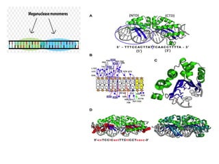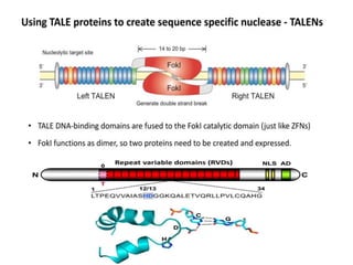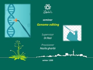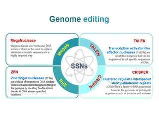 This seminar discusses genome editing techniques including site-specific recombination using Cre/loxP and Flp/FRT systems and site-specific nucleases such as meganucleases, zinc finger nucleases (ZFNs), transcription activator-like effector nucleases (TALENs), and CRISPR/Cas9. CRISPR/Cas9 uses RNA-guided Cas9 nucleases to introduce double-stranded breaks at targeted DNA locations defined by a protospacer sequence, which is matched to repeated sequences in the CRISPR array.