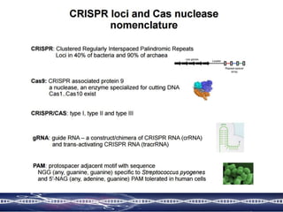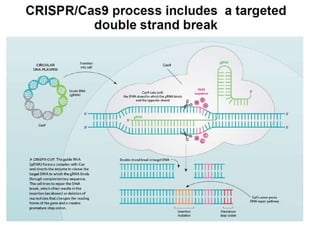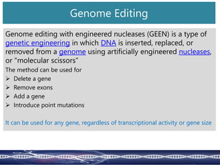 Genome editing uses engineered nucleases to make targeted changes to DNA. There are several methods for engineered nucleases: zinc finger nucleases (ZFNs) use zinc finger proteins fused to FokI nuclease; transcription activator-like effector nucleases (TALENs) use transcription activator-like effector proteins fused to FokI; meganucleases are naturally occurring enzymes; and CRISPR/Cas uses a bacterial adaptive immune system. These nucleases make double-stranded breaks that are repaired through non-homologous end joining or homology-directed repair, allowing changes like gene knockouts, insertions, or replacements. Examples showed using these methods in plants and animals. Each method