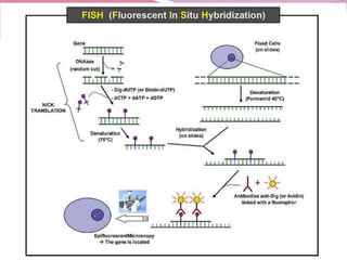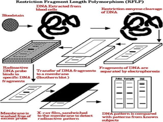 The document discusses genome mapping, detailing its significance in genetics by illustrating the structure and arrangement of genes within chromosomes. It outlines the two main types of genome maps—genetic and physical maps—along with techniques such as somatic cell hybridization and fluorescent in situ hybridization (FISH) that are used for gene mapping and detecting DNA sequences. Additionally, it compares methods like RFLP and RAPD for analyzing genetic diversity, their applications in various fields, and highlights the challenges and benefits associated with these techniques.