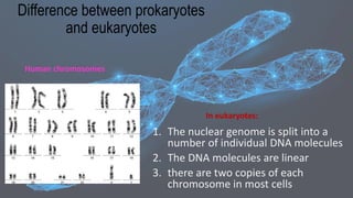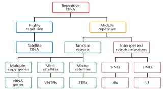 The document discusses the differences in genome structure between prokaryotes and eukaryotes, highlighting that eukaryotic genomes are more complex, with linear DNA molecules and features like repetitive DNA. It explains that genome size does not correlate with an organism's complexity, providing examples to illustrate this point. Additionally, the presence of various forms of DNA, including non-repetitive and repetitive sequences, is explored in relation to the genetic diversity and functional requirements of different organisms.