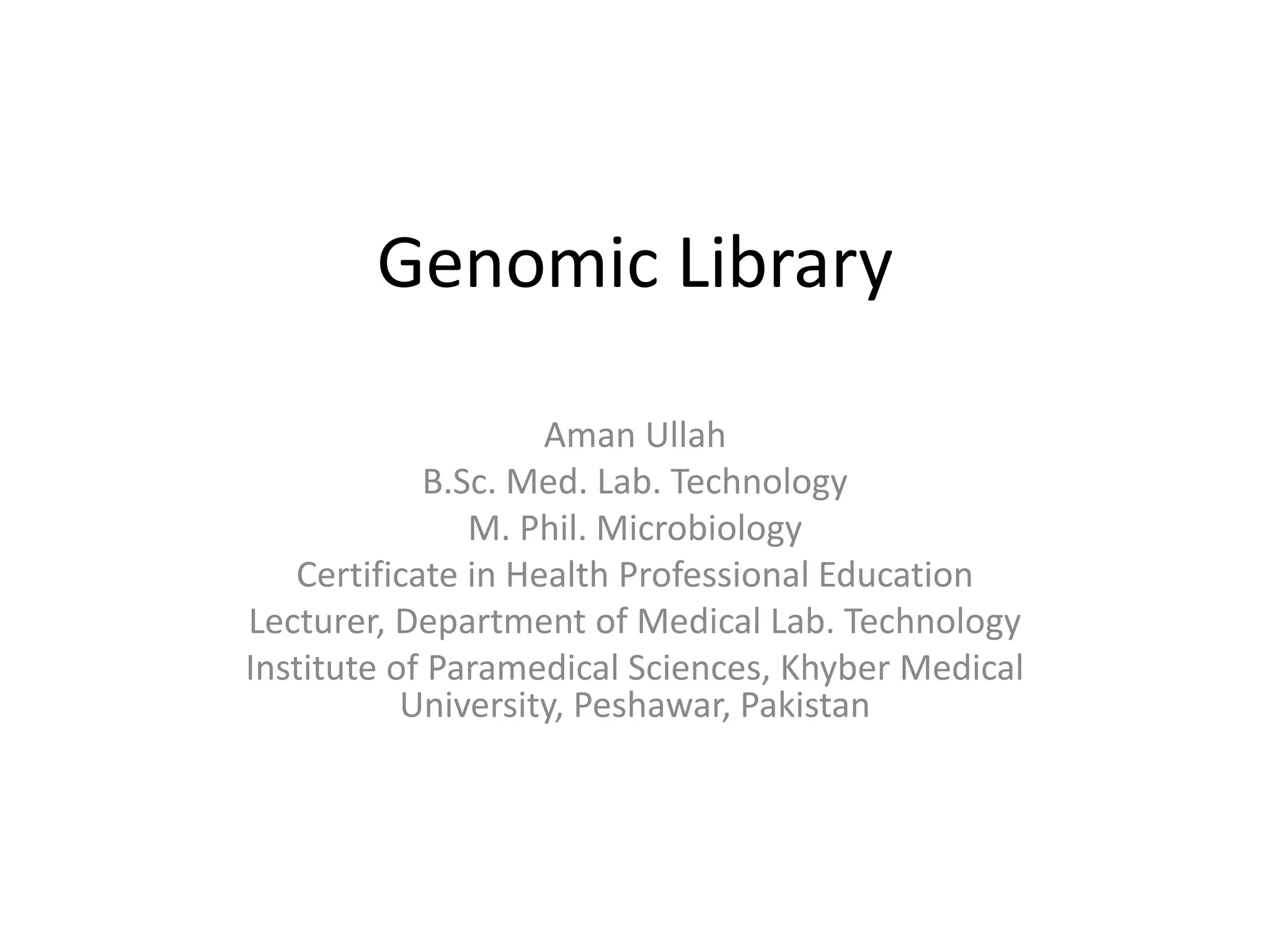 The document discusses genomic libraries. A genomic library contains DNA fragments representing the entire genome of an organism. It is constructed by inserting fragments of partially digested genomic DNA into vectors like plasmids or bacteriophages, which are then introduced into bacteria or yeast. The bacteria replicate and produce clones containing fragments of the original genome, theoretically representing all its sequences. Genomic libraries allow researchers to explore genomic structure and function, map genomes to identify gene locations, and clone DNA segments.