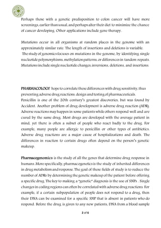 Genomics is the study of all nucleotide sequences in an organism, including genes, noncoding regions, and regulatory elements. Determining the human genome sequence involved forming DNA libraries, sequencing clones, and ordering sequences using computational analysis. Genomics has applications in medicine like gene testing for inherited disorders and understanding drug responses. Pharmacogenomics studies how genetic differences impact individual drug metabolism and effects, aiming to prevent adverse drug reactions by screening for risk alleles.