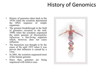 The document provides a comprehensive overview of genomics, detailing its history, types, and applications, including medical, biotechnology, and conservation aspects. It highlights key developments such as the sequencing of various genomes and the evolution of techniques in structural and functional genomics. Additionally, it describes different genomic methods and tools and discusses the implications of genomic data on understanding genetic relationships and improving health outcomes.