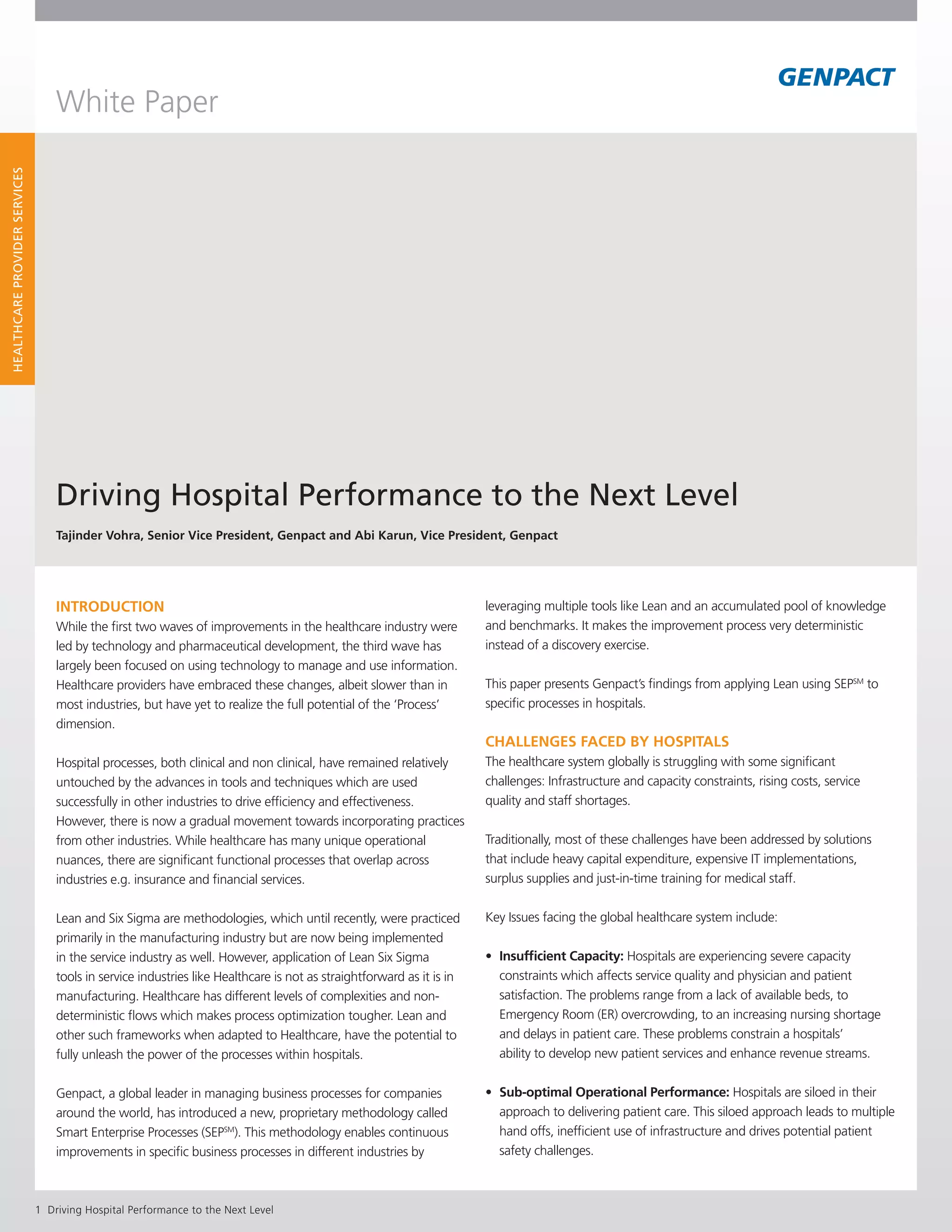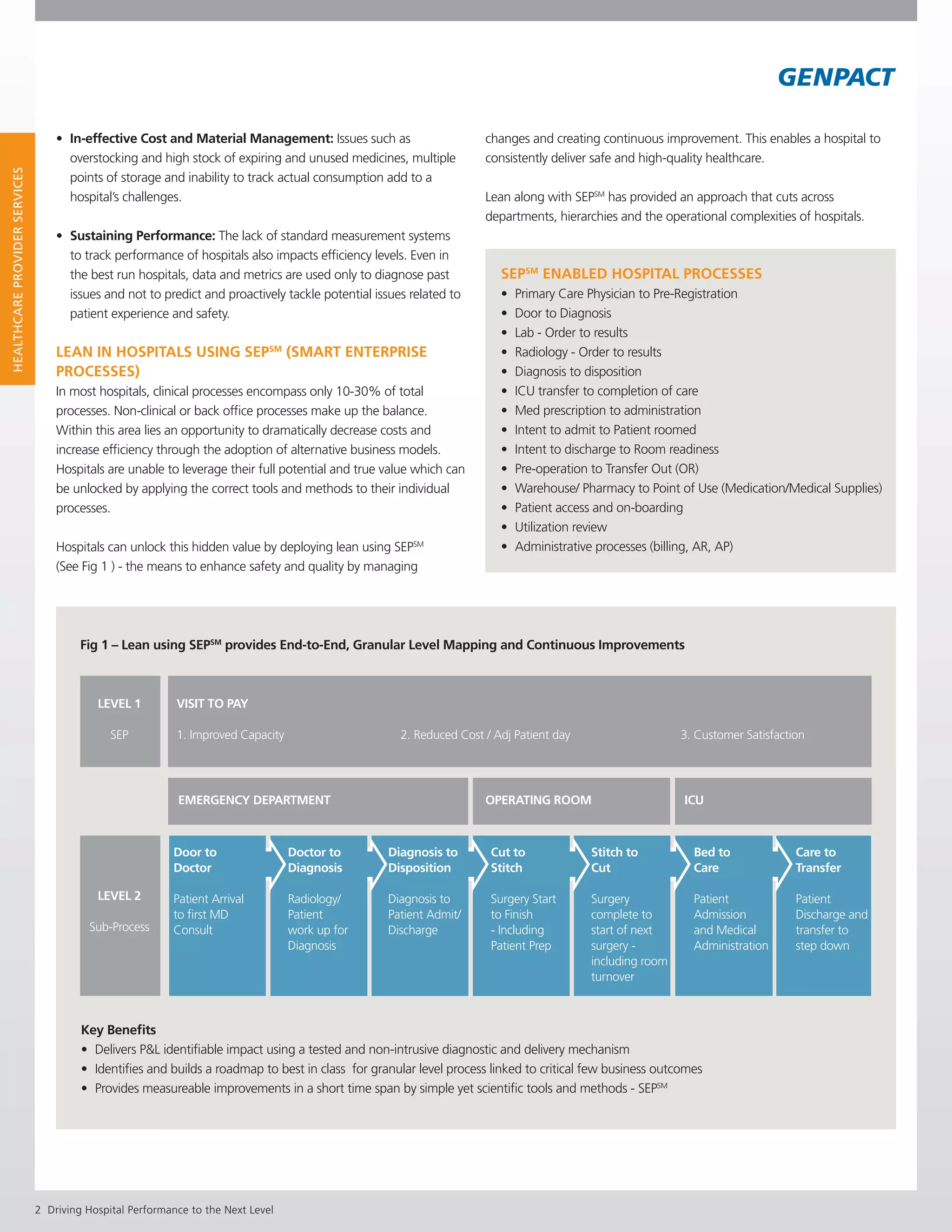 1) The document discusses how hospitals can improve performance by applying Lean methodology and Genpact's proprietary Smart Enterprise Processes (SEPSM) framework to clinical and non-clinical processes.