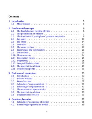 This document outlines the contents of a graduate-level quantum mechanics course. It introduces the major sources consulted in developing the course material and provides an overview of the fundamental concepts covered, including the breakdown of classical physics, polarization of photons, ket and bra spaces, operators, eigenvalues and eigenvectors, observables, measurements, expectation values, and more. The document then delves into specific topics like position and momentum, quantum dynamics, angular momentum, approximation methods, scattering theory and others.