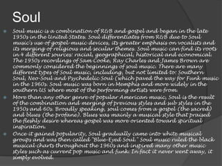 Soul music began in the late 1950s as a combination of R&B and gospel, emphasizing vocalists and merging religious and secular themes. It has roots in racial, geographical, historical, and economic sources. Recordings by Sam Cooke, Ray Charles, and James Brown in the 1950s are commonly considered the beginnings of soul music. Soul music was born in Memphis and the southern US, where most performing artists originated.