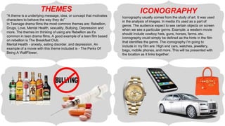 This document discusses the key elements that define the teenage drama genre in film, including setting, themes, iconography, narrative, audience, characters, and style. It analyzes examples of typical teenage drama films and notes that the chosen genre is teenage drama. It outlines the specific elements that will be incorporated into a teenage drama film, such as a narrative about an online deception and mental health themes.