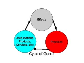 This document discusses the concept of genre in media. It begins by defining genre as a type of media work governed by implicit rules shared by its creators and audience. Genre comes from the French word for "type" or "kind." Works are classified by genre by their creators, marketers, reviewers, and consumers. Genre studies examines common structural elements and patterns in collections of stories. Conventions distinguish genres, like settings and characters in westerns. Genres develop over time through a lifecycle as audiences and creators establish expectations. They allow audiences to understand new works and creators to rely on familiar tropes.