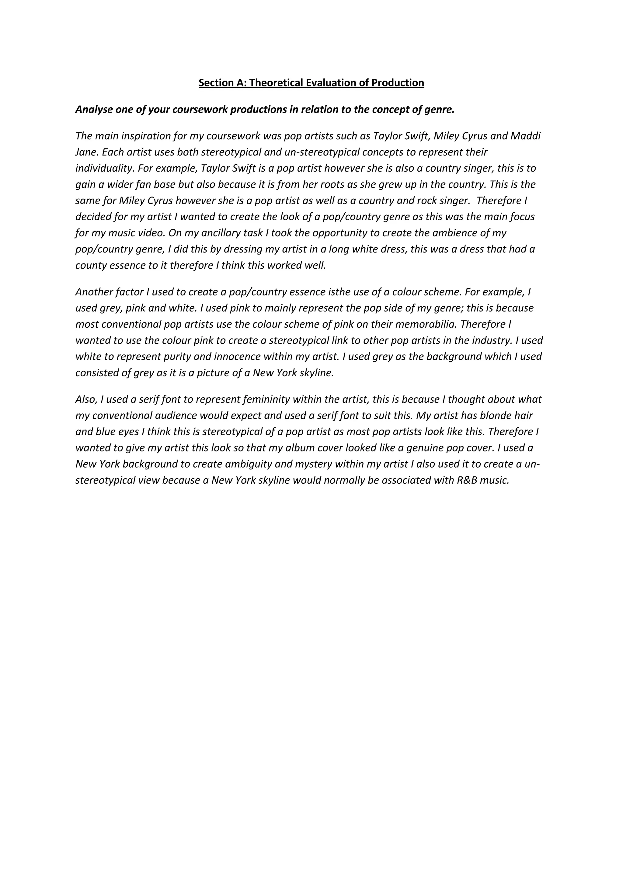 The document analyzes the coursework production of a pop/country artist in relation to genre. To create a pop/country genre, the artist was dressed in a long white dress with country elements. A color scheme of pink, white, and grey was used, with pink representing pop, white representing purity, and grey as the background of a New York skyline. A serif font represented femininity and blonde hair and blue eyes created a stereotypical pop artist look. The New York skyline created ambiguity while being unstereotypical for a pop/country genre normally associated with R&B.
