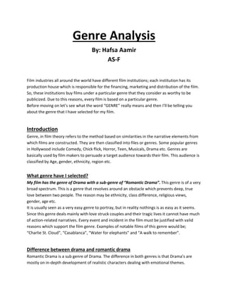 1) The document discusses genre analysis in film, focusing on the romantic drama genre.