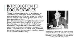 The document discusses different types of documentaries including fully narrated, mixed, fly on the wall, docudrama, docusoap, and self-reflective. It provides details on the key features and examples of each type. Documentaries aim to document reality through observation, interviews, dramatization, and exposition in order to inform, investigate, educate, and entertain audiences on factual subjects. Pioneering documentary maker John Grierson coined the term documentary and defined it as the creative treatment of actuality.