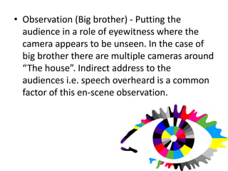 The document discusses different genres of documentaries including observation, interviews, and dramatization. It also covers documentary techniques like mise-en-scene, exposition, narration styles (fully narrated, fly on the wall, mixed), self-reflexive, docu-drama, and docu-soaps. Observation involves putting the audience in the role of eyewitness through unseen cameras. Interviews are used to contrast observation and are structured as intercut fragments or uninterrupted sequences. Dramatization portrays events the filmmaker couldn't access in real life.