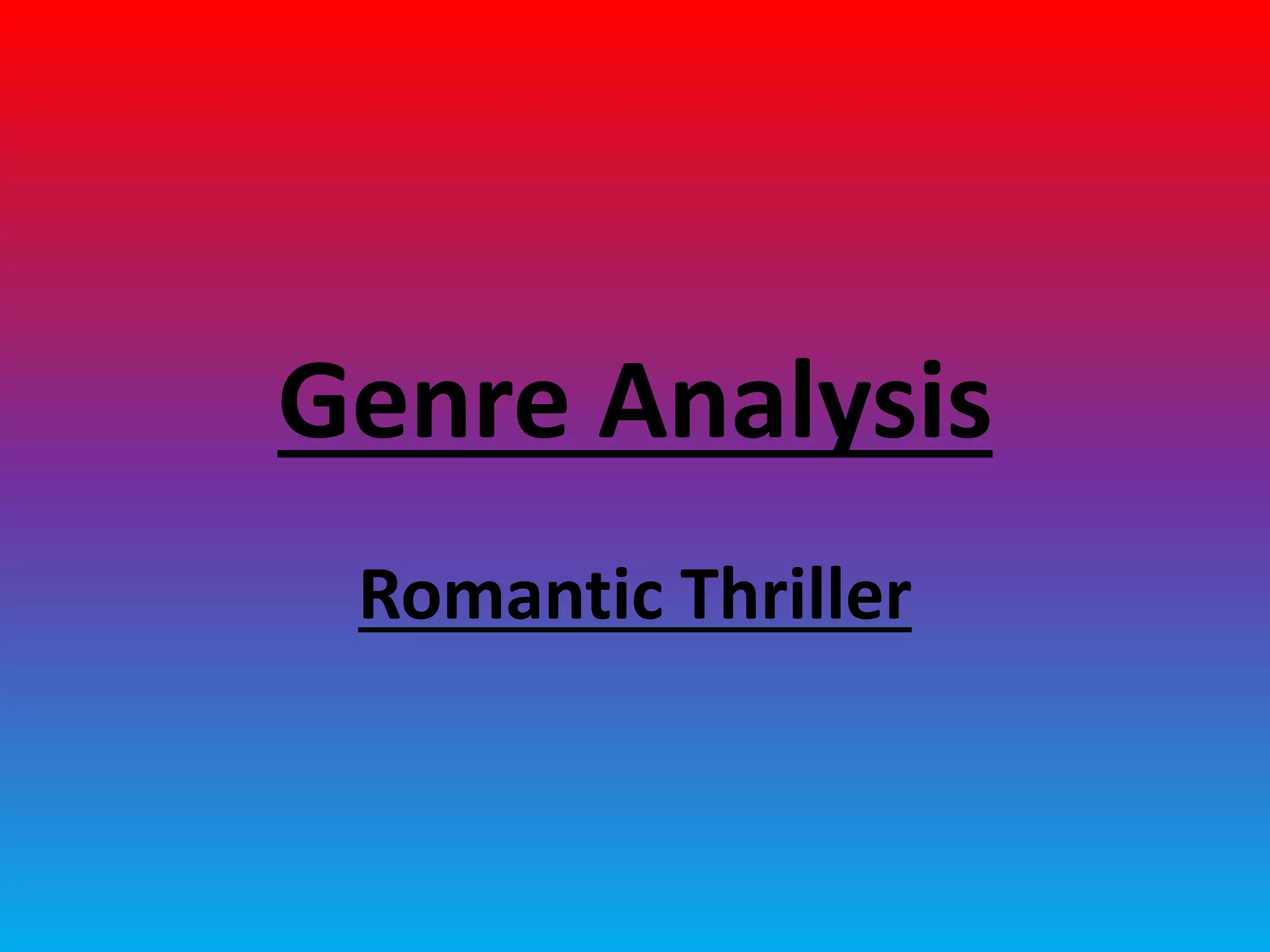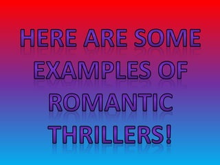 A romantic thriller is a hybrid genre that blends elements of romance and thriller stories. It features stereotypical characters like possessive male leads and dependent female characters. The genre appeals to a wide audience by combining the romance that appeals to women with the thrills that appeal to men. Example films provided are The Bodyguard, Prom Night, The Tourist, and The Adjustment Bureau, which were commercially successful romantic thrillers from the 1990s-2010s with budgets between $20-100 million.