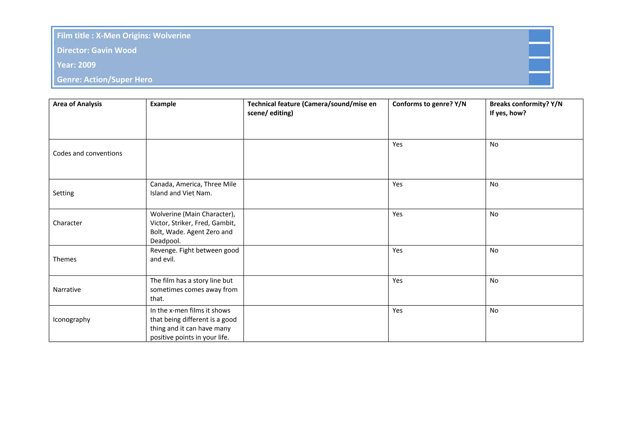 The film X-Men Origins: Wolverine from 2009, directed by Gavin Wood, follows the main character Wolverine across settings in Canada, America, Three Mile Island and Vietnam as he seeks revenge against Victor and Striker. The film generally conforms to the action/superhero genre with themes of revenge and the fight between good and evil, though at times the narrative comes away from the main story line. The film promotes a message that being different, as the mutants are, can have positive aspects and that difference should be embraced.