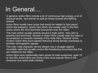 Action films generally contain a lot of physical stunts, fighting, and chase scenes. They usually feature a male action hero battling incredible odds against a villain. While traditionally aimed at young male audiences, some modern action films now include stronger female leads to broaden appeal. The James Bond franchise exemplifies popular action films, following a secret agent who uses weapons and vehicles to defeat villains threatening global security.