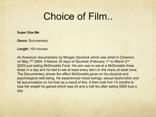 The documentary Super Size Me follows filmmaker Morgan Spurlock over 30 days as he eats only food from McDonald's. During this time, he eats three meals per day from the fast food chain and consumes every item on their menu at least once. The documentary shows how this diet impacts Spurlock's physical and psychological health, resulting in weight gain, mood swings, and liver fat accumulation. It took Spurlock 14 months after the film to lose the 24.5 pounds he gained during the 30 day experiment.