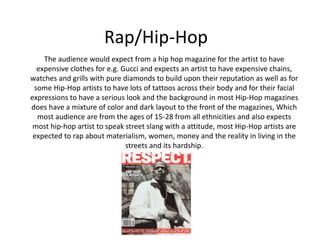 - Hip-hop artists are expected to wear expensive brands and have tattoos, serious expressions, and rap about materialism, money and street life.