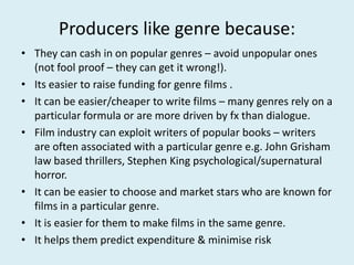Producers, distributors, and audiences all benefit from genre in film. Producers can more easily get funding and write scripts for genre films, which also allows them to predict costs and market films based on familiar genres. Distributors can effectively promote genre films by targeting audiences who expect certain genre conventions. Audiences enjoy genre films because they provide a sense of familiarity and anticipation regarding how conventions will be followed or subverted. However, genres are not clearly defined and often overlap, with some films combining elements of multiple genres.